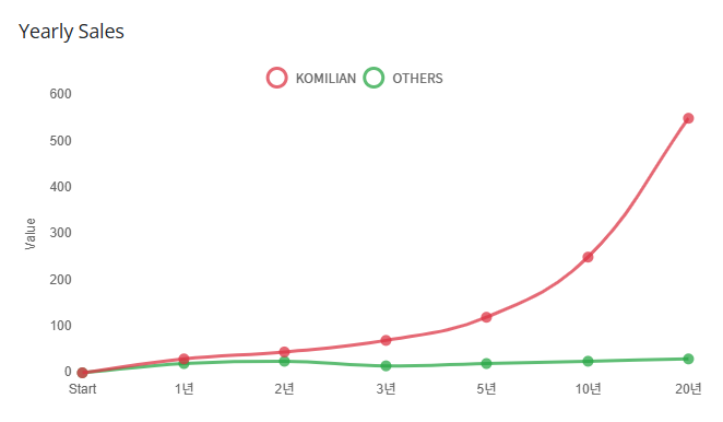 하지만, 코밀리언의 경우에는 새로 유입된 고객도 있지만, 기존에 유입되었던 모든 고객의 재구매에 대한 수수료까지 더해져서 오른쪽 그래프의 회색바와 같이 시간이 지날수록 실적은 기하급수적으로 늘어나게 됩니다.